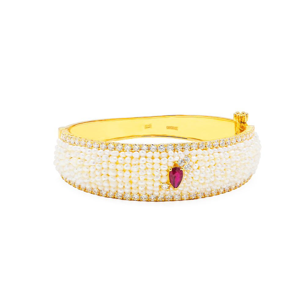 22K Yellow Gold (23.741 grams), VS, G Color Diamond (2.236 carat), Ruby (0.083 grams), and Natural Bahraini Pearls (1.684 grams) approximately.